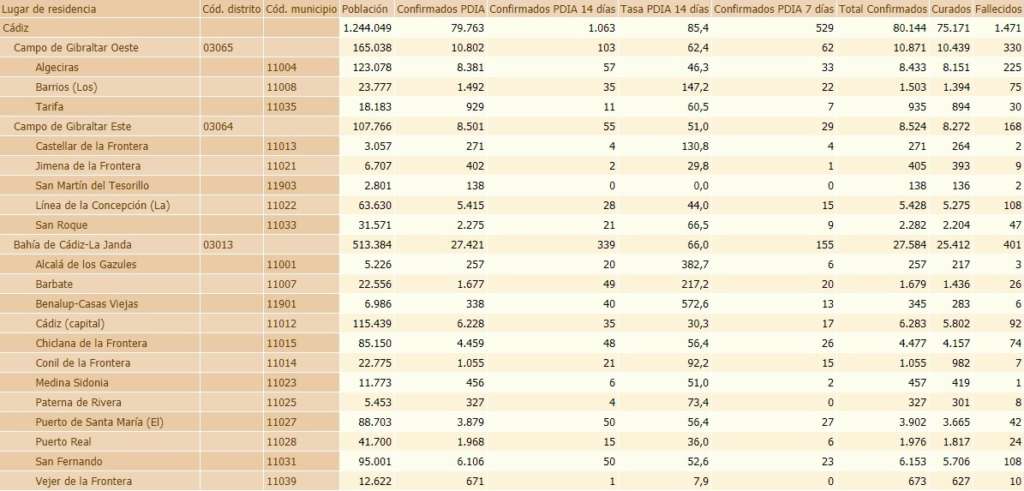 Datos acumulados en la provincia de Cádiz, remitidos al Ministerio de Sanidad