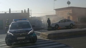 Efectivos del Cuerpo de Bomberos de San Fernando comenzaron a sofocar a las 20.15 horas de este viernes 11 un incendio que se produjo en un vehículo que se encontraba estacionado a escasos metros del propio Parque de Bomberos, situado en la carretera Batería de La Ardila, comúnmente conocida como carretera de Camposoto.