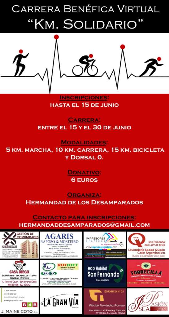 Carrera solidaria con la que se pretende la difusión de hábitos de vida saludable, entre los que se encuentra la práctica del deporte. Además esta iniciativa tendrá también una finalidad solidaria, pues contribuirá al sostenimiento de las diferentes actividades y colaboraciones con entidades e instituciones que en este ámbito desarrolla la Hermandad de los Desamparados de San Fernando.
