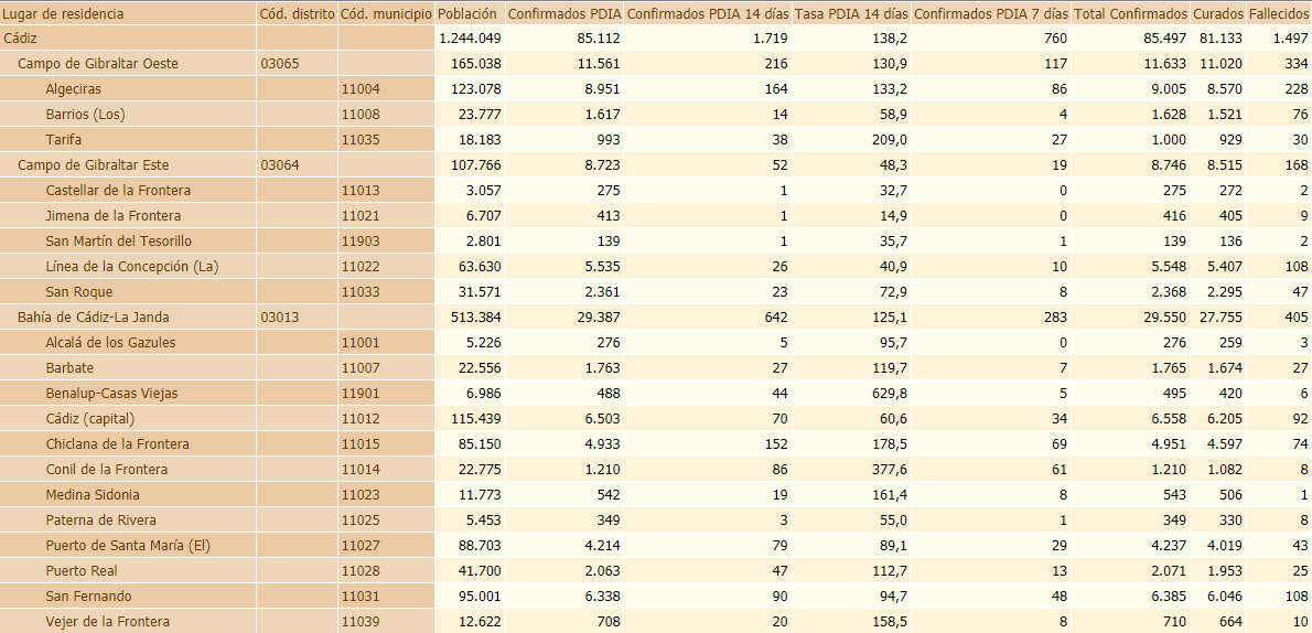 Datos acumulados en la provincia de Cádiz, remitidos al Ministerio de Sanidad