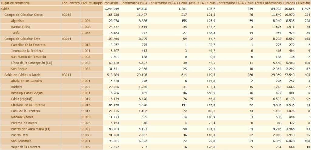 Datos acumulados en la provincia de Cádiz, remitidos al Ministerio de Sanidad