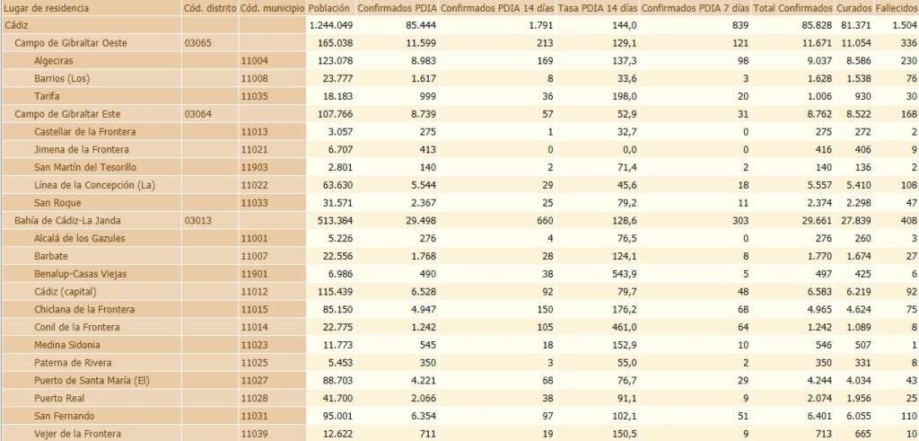 Datos acumulados en la provincia de Cádiz, remitidos al Ministerio de Sanidad