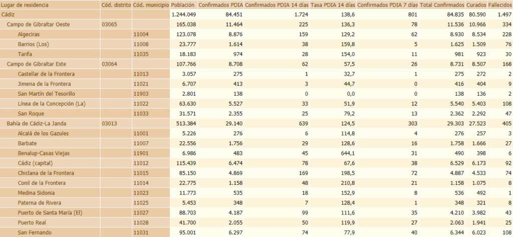 Datos acumulados en la provincia de Cádiz, remitidos al Ministerio de Sanidad