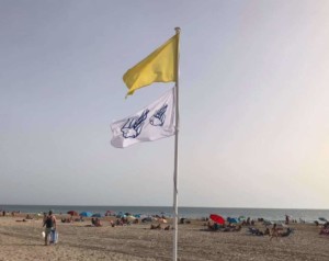 En la playa de Camposoto ondea junto a la bandera amarilla, otra blanca con el dibujo de dos medusas. Esto alerta de la presencia de este mar en el agua.