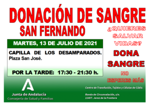 Una vez más desde CTTC de Cádiz piden a la población isleña que done sangre y plasma, por lo que convocan una nueva recolecta para el próximo martes 13 de julio en la en la Capilla de los Desamparados, en la Plaza San José, en horario de tarde (de 17:30 a 21:30 horas).