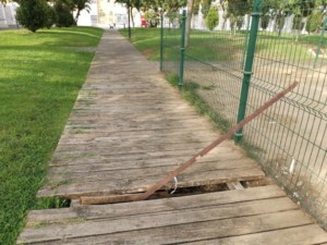 3R considera "inadmisible" que un espacio público, como la Plaza de las Esculturas, presente "tal nivel de abandono", muestras de "haber sido dejado caer a su suerte" cuando se puede encontrar barandillas de protección exterior partidas, protegidas con una valla de obras; con el entarimado de madera lleno de boquetes, hasta señalado con un tubo para que nadie pueda terminar en algún centro sanitario; solerías partidas; escalones rotos; tubos en medio de la nada; mugre por todos lados; luminarias de suelos partidas; bancos sin una gota de barniz, etc.