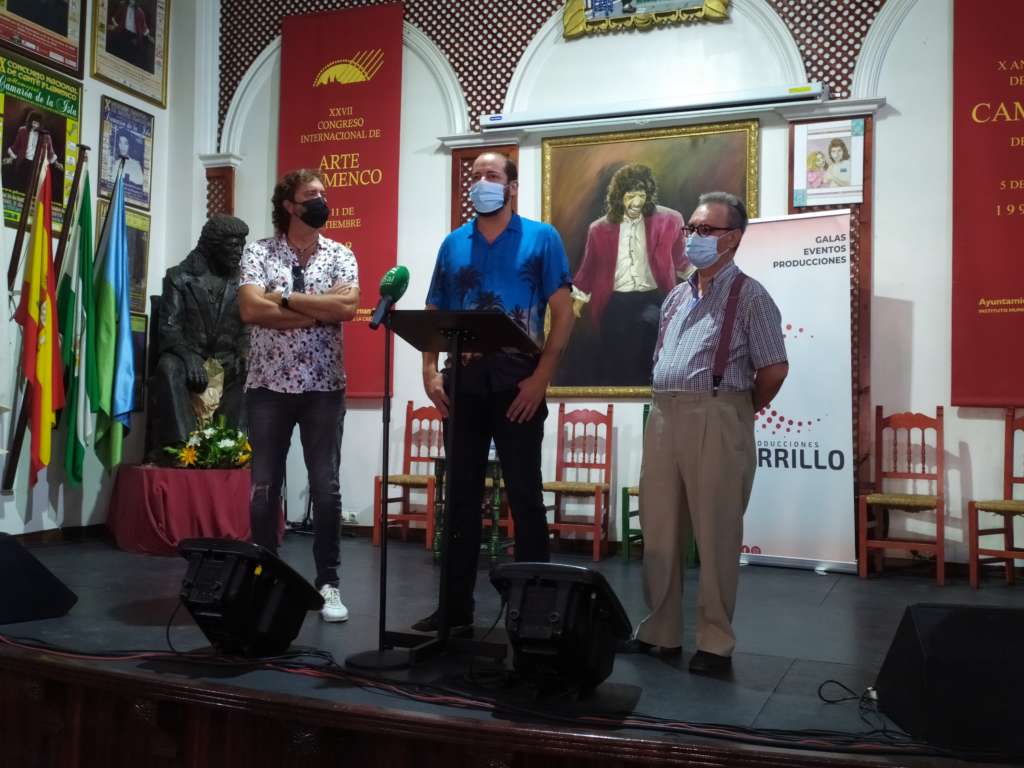 El presidente de la Peña Flamenca Camarón de La Isla, Antonio León; el gerente de Producciones Carrillo, Jesuli Carrillo, y el cantaor Jesús Castilla han presentado en la emblemática peña el nuevo ciclo de actuaciones que se desarrollará en dicho espacio durante la recta final del presente verano.