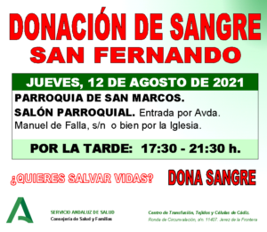 Una vez más desde CTTC de Cádiz piden a la población isleña que donen sangre y plasma, por lo que convocan una nuevas recolecta -en horario de tarde (de 17:30 a 21:30 horas)-, hoy jueves 12 de agosto en la Parroquia Santo Cristo,-Plaza Madre Teresa de Calcuta-.
