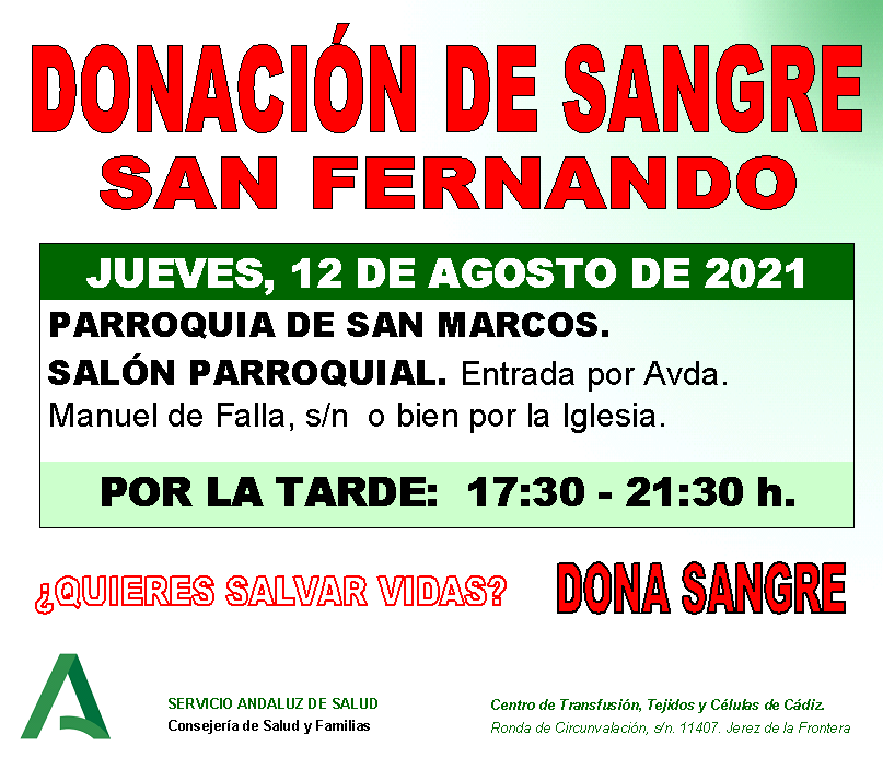 La Red Andaluza de Medicina Transfusional, Tejidos y Células de la Consejería de Salud y Familias una vez más hace un llamamiento urgente a los isleños para acudan a donar sangre y plasma con el fin de garantizar para cubrir las necesidades de los centros sanitarios de San Fernando.