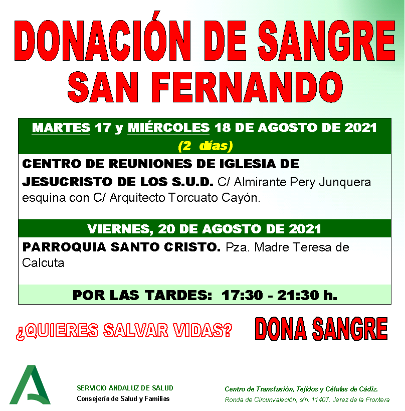 La Red Andaluza de Medicina Transfusional, Tejidos y Células de la Consejería de Salud y Familias una vez más hace un llamamiento urgente a los isleños para acudan a donar sangre y plasma con el fin de garantizar para cubrir las necesidades de los centros sanitarios de San Fernando.
