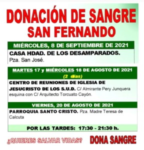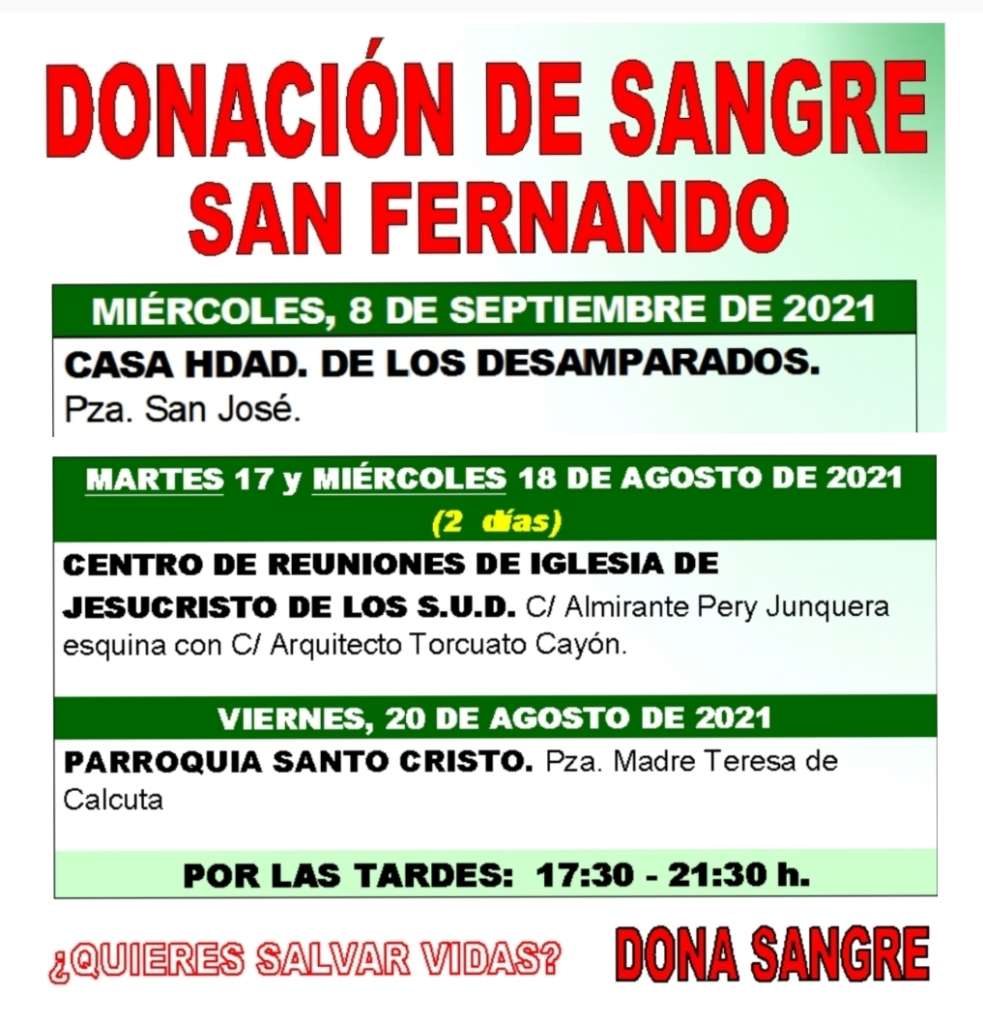 Una vez más desde CTTC de Cádiz piden a la población isleña que done sangre y plasma, por lo que convocan una nueva recolecta para este miércoles 8 de septiembre en la Capilla de los Desamparados, en la Plaza San José, en horario de tarde (de 17:30 a 21:30 horas).