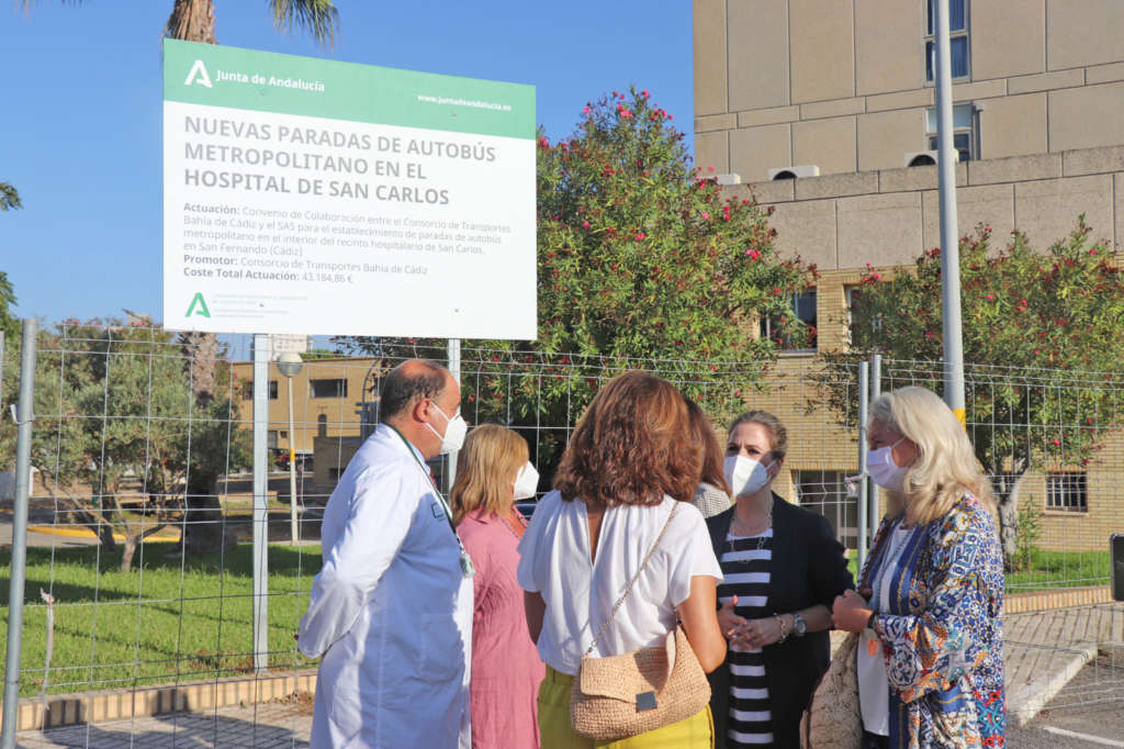 La delegada de la Junta de Andalucía en Cádiz, Ana Mestre, ha visitado este lunes el entorno del hospital San Carlos, en San Fernando, para comprobar el inicio de la instalación de dos paradas de autobús que va a instalar el Consorcio Metropolitano de Transportes de la Bahía de Cádiz y que dotará de este servicio a los usuarios del centro hospitalario, una de bajada en la entrada principal del hospital, y otra de subida en el lateral del edificio hospitalario, que estará equipada con marquesina y mobiliario urbano con una inversión de casi 70.000 euros por parte de la Junta.