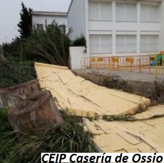 Romero enumera, a modo de ejemplo de esta realidad, varias de las deficiencias que aún presentan los centros escolares. El portavoz comienza con el Colegio Casería de Ossio, en cuyo perímetro permanece los escombros caídos de un muro que no se ha vuelto a levantar y que presenta pronunciado desnivel que supone un riesgo de caída para los más pequeños, ya que sólo cuenta con unas vallas portátiles como única protección. Muro que lleva cayéndose desde hace cuatro años. Además, el centro cuenta con malas hierbas de altura considerable que asoman de las fisuras del firme del patio. “En este sentido la responsabilidad es compartida con la Consejería de Educación de la Junta de Andalucía, ya que se trata de un trato estructural. En cualquier caso, es muy triste ver como las administraciones se olvidan una vez más de la Casería y como este muro caído parece anunciar el próximo derribo de las casetas y establecimientos hosteleros de la playa de la barriada”, indica Romero.