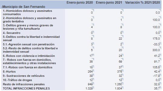 El municipio de San Fernando ha registrado, según el Portal Estadístico de Criminalidad del Ministerio del Interior un incremento del 35,7 por ciento de infracciones penales en el primer semestre del 2021 con respecto al mismo periodo de tiempo que el pasado año 2020. En total han sido 1.804.