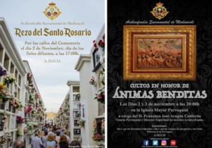 La Hermandad también celebrará solemnes cultos por las Ánimas Benditas del Purgatorio los días 2 y 3 de noviembre a las 20:00 horas en la Iglesia Mayor Parroquial. La Sagrada Cátedra estará a cargo del Rvdo. P. Francisco José Aragón Calderón, Vicario Parroquial y Director Espiritual de la Archicofradía.