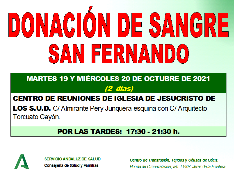 Una vez más desde CTTC de Cádiz piden a la población isleña que donen sangre y plasma, por lo que convocan dos nuevas recolectas -en horario de tarde (de 17:30 a 21:30 horas)-, para martes y miércoles, 19 y 20 de octubre en el Centro de Reuniones de la Iglesia de Jesucristo de los SUD en la calle Almirante J.M. Pery Junquera esquina con la calle Arquitecto Torcuato Cayón.