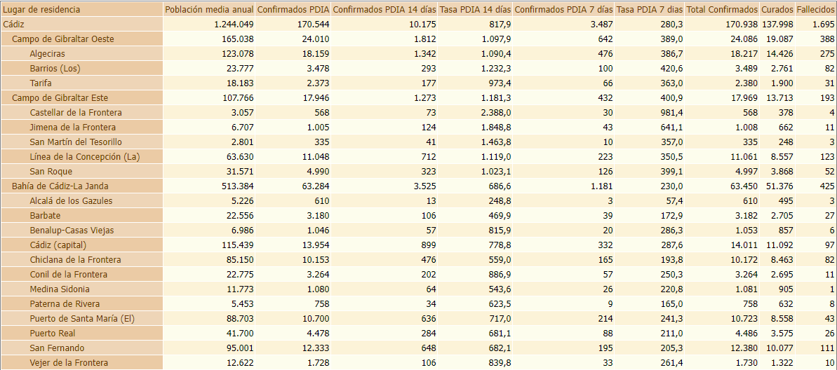 Por provincias: en Almería (181 hospitalizaciones, de las que 27 en UCI), Cádiz (246 hospitalizaciones, de las que 25 en UCI), Córdoba (181 hospitalizaciones, de las que 28 en