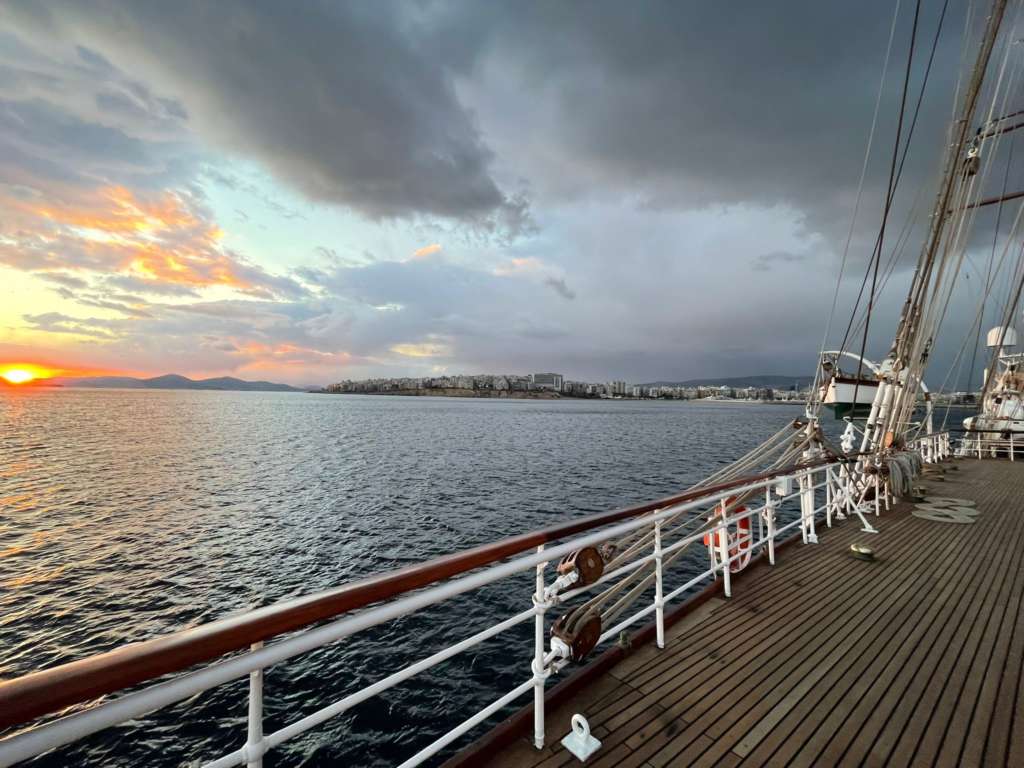 El buque Juan Sebastián De Elcano amanece frente al puerto del Pireo, donde recalará desde este viernes en la primera escala de su XCIV Crucero de Instrucción.