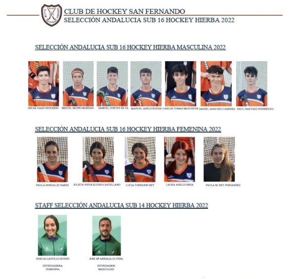 Las jugadoras que aporta el Club de Hockey San Fernando son; Paula Bey, Laura Anillo, Paula González Barba, Julieta Potoliccio y Lucia Torrejón. Mientras que los jugadores son; Oscar Gago, Miguel Muiño, Manuel Anelo, Samuel Cortés, Raúl Narváez, Daniel Sánchez y Carlos Tomas Mazueco. Por otro lado también participarán los técnicos; Noelia Castillo y José María Arriaza Olvera.
