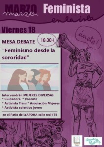 Por lo que este viernes 18 de marzo a las 18:30 horas en la calle Real, en la sede de Apdha, tendrá lugar otra mesa redonda con mujeres de diferentes realidades llevada a cabo por la misma entidad y La Levantera, la cual y se enmarca dentro de las actividades organizadas con motivo del 8 de Marzo , es una mesa debate sobre 'Feminismo desde la sororidad'.