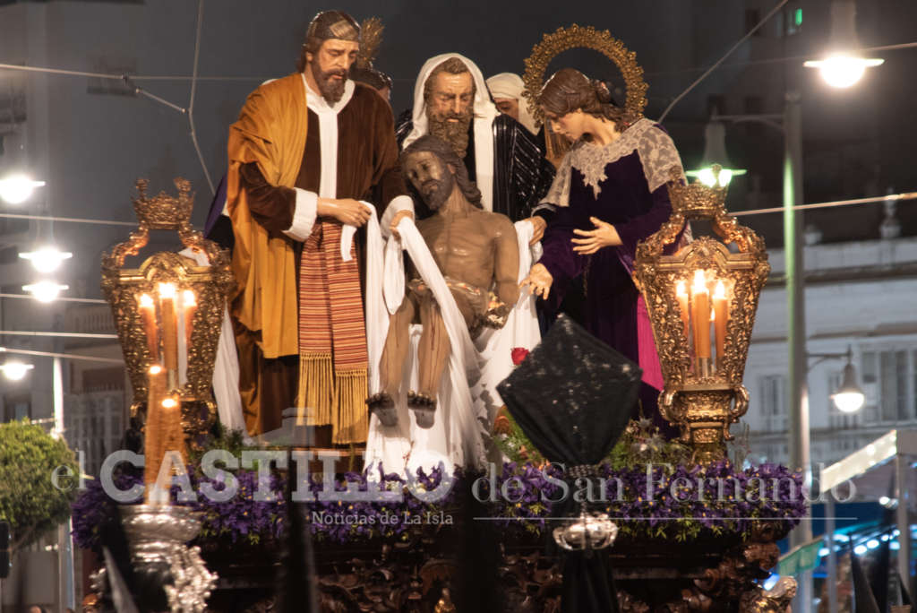 En ese mismo momento, la Hermandad de Santo Entierro encaminaba la calle Real camino de la Carrera Oficial, con un cortejo formado además de por sus hermanos de fila, por la Corporación Municipal, así como representantes de estamentos militares en una organización exquisita. Esta cofradía pone su broche de oro en la Plaza del Carmen, donde en total oscuridad la hermandad avanza por la misma en el más absoluto silencio.