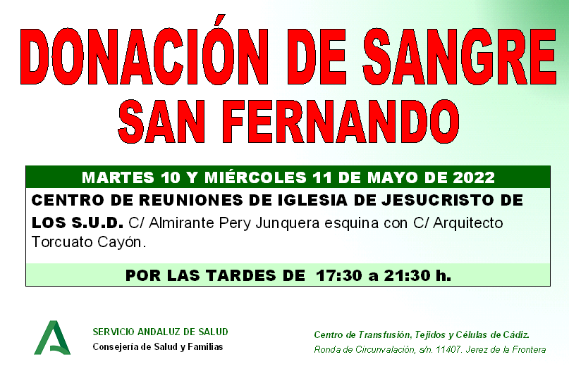 Una vez más desde CTTC de Cádiz piden a la población isleña que done sangre y plasma, por lo que convocan una nueva recolecta para el martes 10 y miércoles 11 de mayo en Centro de Reuniones de la Iglesia de Jesucristo de los S.U. D. (calle Almirante J.M. Pery Junquera esquina con la calle Arquitecto Torcuato Cayón), en horario de tarde (de 17:30 a 21:30 horas).