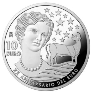 Para conmemorar el XX Aniversario del Euro, la Fábrica Nacional de Moneda y Timbre Real Casa de la Moneda Española emitió este lunes 4 de julio, una moneda en plata con facial de diez euros, siendo el precio de venta recomendado de 66,55 euros.