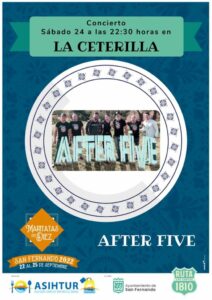 El sábado 23 también se desarrollarán tres conciertos, comenzando por el de Marijose Fernández y Miguel Ramos en 'Mi Pilar' a las 15:30 horas. A éste le seguirán el de Carmen 'La Shica' y Gaby a las 21:00 horas en 'El Bolerín', bar situado en la Avenida San Juan Bosco número 8, y el de 'After Five' a las 22:30 horas en 'La Ceterilla', restaurante ubicado en la Plaza Manuel de la Puente s/n. Este ciclo de conciertos concluirá el domingo 25 a las 15:30 horas en 'Mi Pilar, con la actuación de Juan Carlos Nieto.