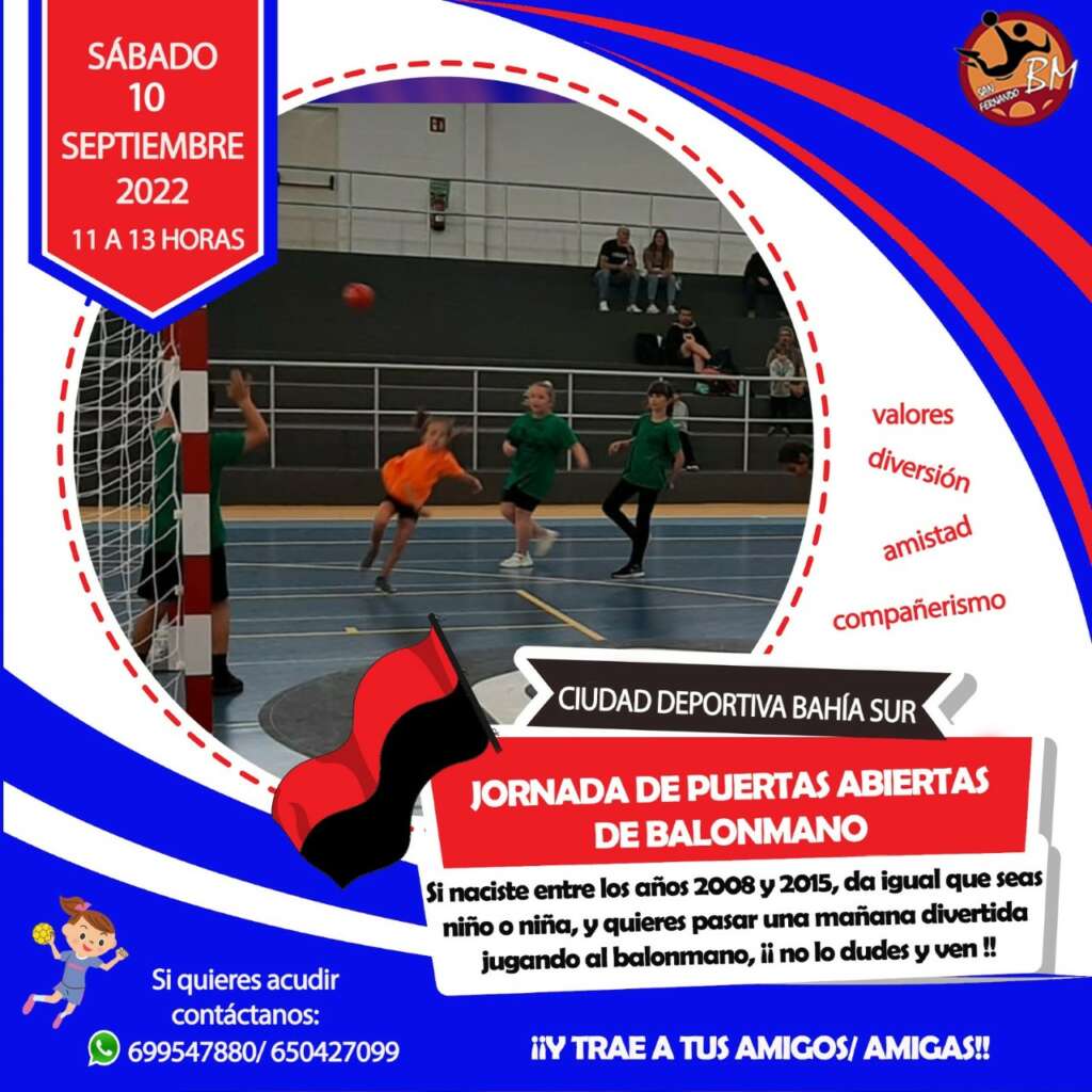 Desde el C Bm San Fernando se hace un llamamiento para todo aquel chico o chica que quiera practicar balonmano. Se buscan jugadores desde categoría benjamín, 8 y 9 años, hasta senior. Para ello el Club ha organizado una jornada de captación, que tendrá lugar el sábado 10 en horas de 11:00 a 13:00 en el Pabellón de Bahía Sur.