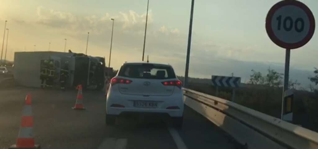 La circulación ha sido lenta debido a la espera de la llegada de la grúa para retirar el camión volcado que obstaculizan tambien el carril izquierdo provocando varios kilómetros de retenciones.