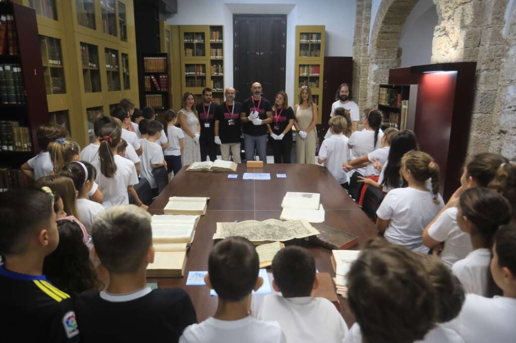 La visita a la Biblioteca Lobo, ubicada en la planta baja del Edificio Consistorial, ha sido una de las primeras actividades que han formado parte de la celebración este año de La Noche Europea de los Investigadores, coordinada por la Universidad de Cádiz (UCA).