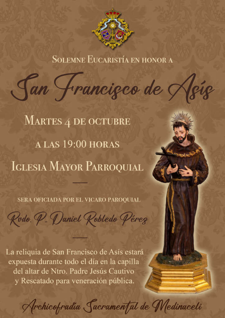 Cabe destacar que la Archicofradía Sacramental de Medinaceli de San Fernando tiene carta de Hermandad con la Orden Franciscana desde el año 1988, por este motivo y como es tradicional, ha organizado una Solemne Eucaristía en Honor a San Francisco de Asís que tendrá lugar el próximo martes día 4 de octubre a las 19:00 horas en la Iglesia Mayor de San Pedro y San Pablo.