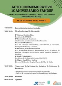 La Federación Andaluza de Familiares, Enfermos de Parkinson y Trastornos del Movimiento (FANDEP) celebra su quince aniversario el 19 de octubre, en la ciudad de San Fernando (Cádiz), haciendo reconocimiento de toda su trayectoria como federación, así como homenajear a las personas que hicieron posible su fundación en 2007. Para ello ha contado con un patrocinio de la Diputación Provincial de Cádiz.