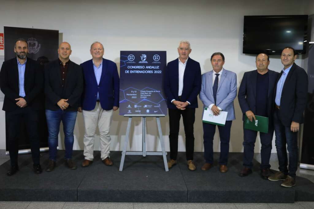 Este miércoles se ha presentado el Congreso de Entrenadores organizado por la Real Federación Andaluza de Fútbol que se celebrará en San Fernando el 11 y 12 de noviembre en el Teatro de la Compañía de María. A esta cita han acudido los concejales de deporte, Francis Posada y Antonio Rojas, junto al Vicepresidente de la RFAF, José Antonio Bernal Rosado, el Presidente del Comité de Entrenadores de la RFAF, Vicente Domínguez Bejarano y el Delegado provincial de la RFAF, Pedro Curtido.