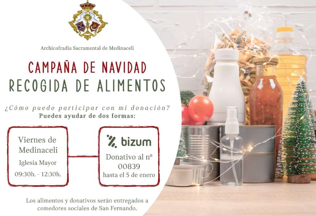 Para poder participar en la campaña, se puede colaborar llevando alimentos cada viernes a la Iglesia Mayor Parroquial, en horario de 9:30 a 12:30 horas, coincidiendo con los “viernes de Medinaceli”, o bien realizando un donativo a través del Bizum de la Archicofradía, nº 00839, hasta el 5 de enero.