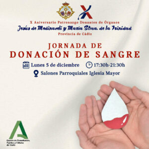 Esta jornada de donación forma parte del programa de actos que la Archicofradía ha tenido a bien organizar para conmemorar el X Aniversario del nombramiento como Patronos de Donantes de Órganos de Nuestro Padre Jesús Cautivo y Rescatado y María Santísima de la Trinidad.