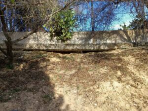 En el caso del muro del cementerio se llevó a cabo una actuación de pintura y relleno que no corrigió los huecos y espacios que existen en su base. En el caso de este muro próximo a la Plaza de Las Sirenas, también existen estos huecos del terreno que van a ir aumentando si el gobierno municipal sigue sin hacer nada.