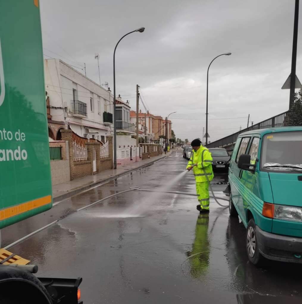 El Ayuntamiento de San Fernando a lo largo de la mañana ha realizado limpiezas por varias zonas en las que al levantarse los lodos han quedado sucias y con malos olores.
