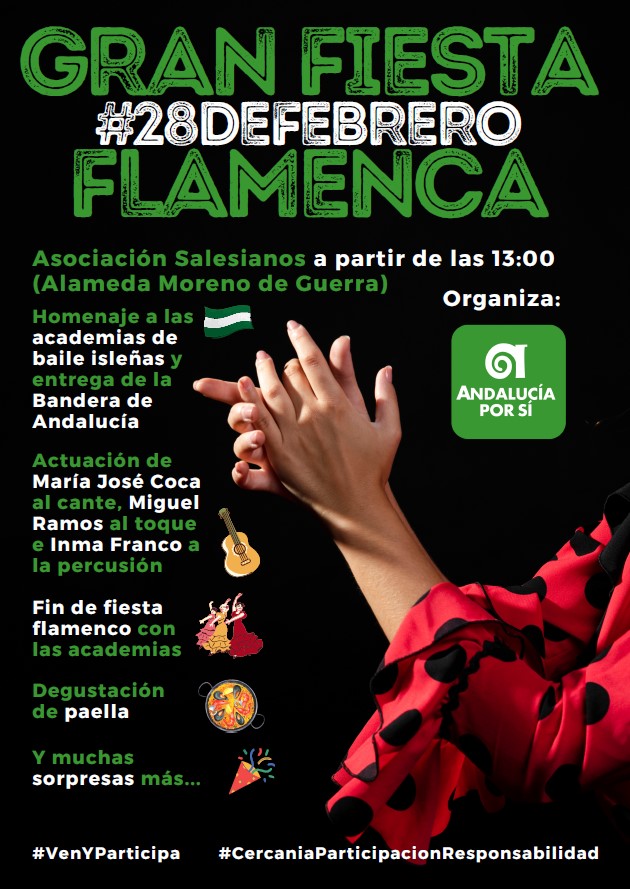 “Es de justicia que aprovechemos nuestro Día de Andalucía para reconocer la labor de nuestras academias en activo, porque ellas también son garantes y guardianas del arte flamenco que nos define y que forma parte imprescindible de la identidad cultural del pueblo andaluz. Las academias isleñas han sido, son y serán inagotable cantera de talentos. Por eso desde AxSí sólo tenemos palabras de agradecimiento para aquellas personas que están al frente de las mismas, profesionales como Virginia y Verónica Vélez; Marisa Sainz; Lucía Moreno; David Nieto; y Carmen, Silvia, María José, Pepa y Sonia Peña. Su trabajo y el de sus alumnos y alumnas nos cargan de motivos para estar orgullosos como isleños de sus logros. Confiamos en que la Bandera de Andalucía que le entregamos les inspire en sus nuevos retos y que la porten orgullosos en concursos y eventos”, detalla Romero.