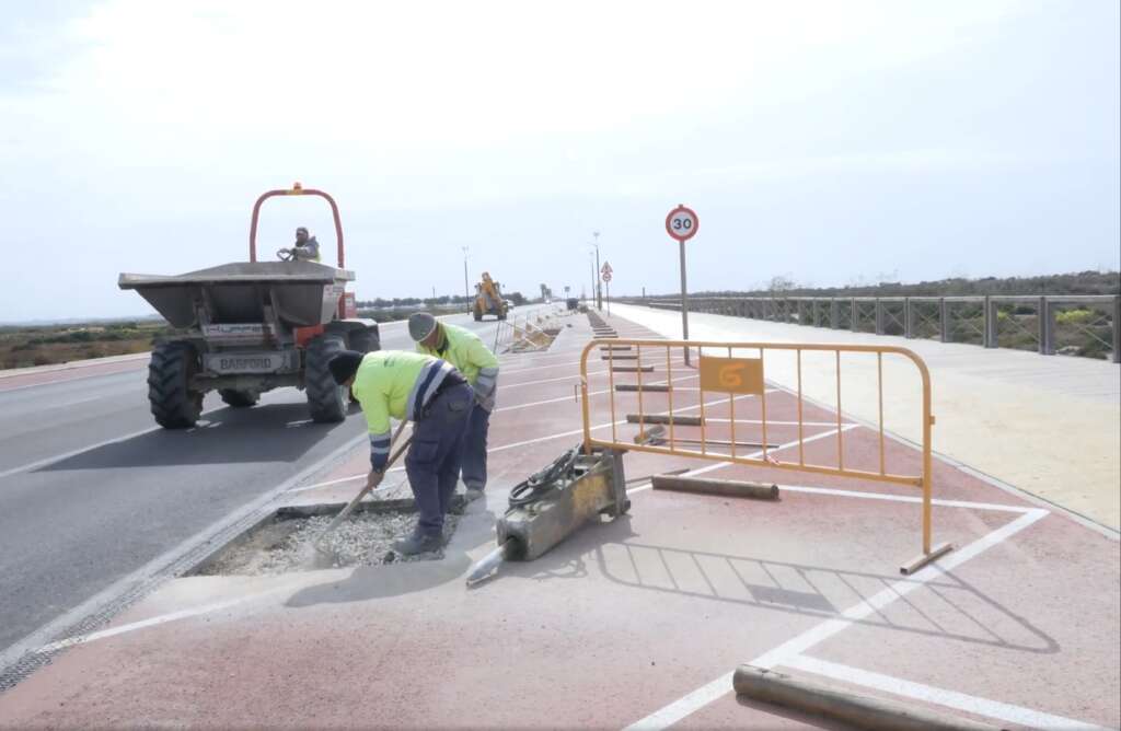 Esta mañana ya han dado comienzo los trabajos de reparación de los desperfectos en el asfaltado de la zona de los aparcamientos de la playa de Camposoto, que se van a hacer con cargo a la garantía de esta obra ejecutada por la empresa Construcciones Garrucho.