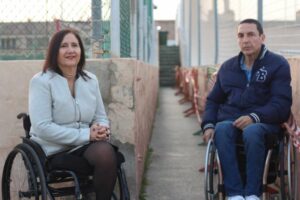 La concejala del PP isleño, Malu del Río, junto al también deportista adaptado Alejandro García, han denunciado la incapacidad de acceder a los aseos que tienen las personas con movilidad reducida y utilizan las instalaciones deportivas municipales de Bahía Sur.