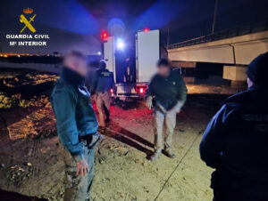 Tras producirse finalmente el desembarco de la droga, los guardias civiles hicieron patente su presencia mediante el uso de señales acústicas y luminosas, iniciándose un seguimiento del vehículo en cuestión, el cual se trataba de un camión frigorífico de la marca Mercedes.