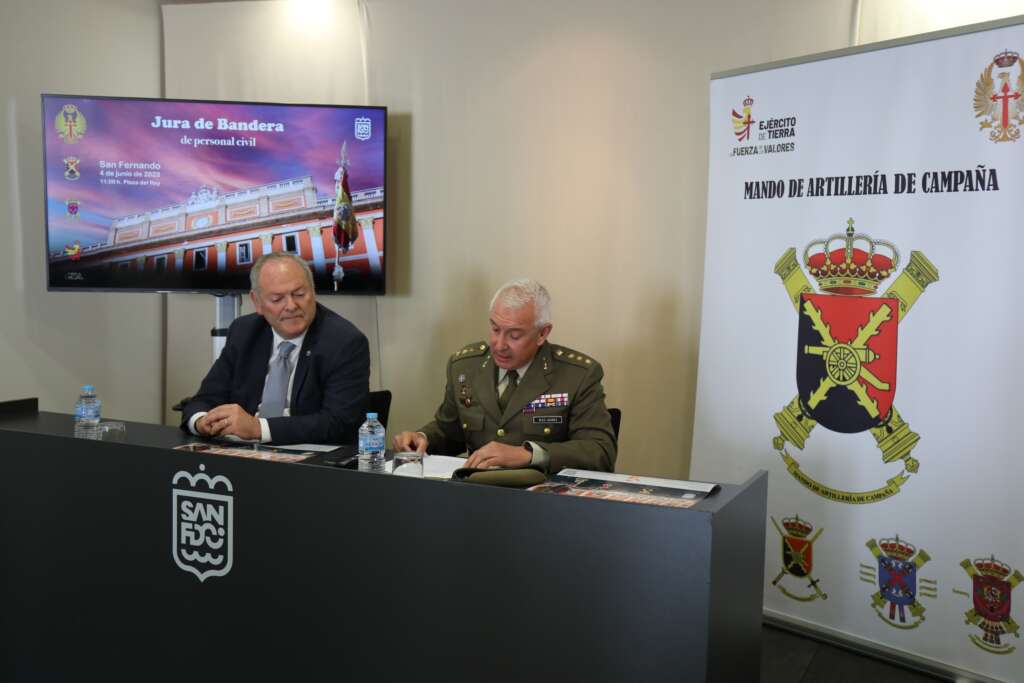Antonio Rojas, cuarto teniente de alcaldesa del Ayuntamiento de San Fernando, y Julián González, coronel jefe del Regimiento de Artillería de Costa número 4, han comparecido hoy para informar de los detalles de esta próxima Jura de Bandera, que se sumará a los actos organizados con motivo del Día de las Fuerzas Armadas.