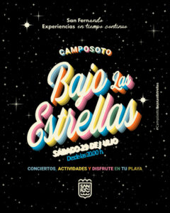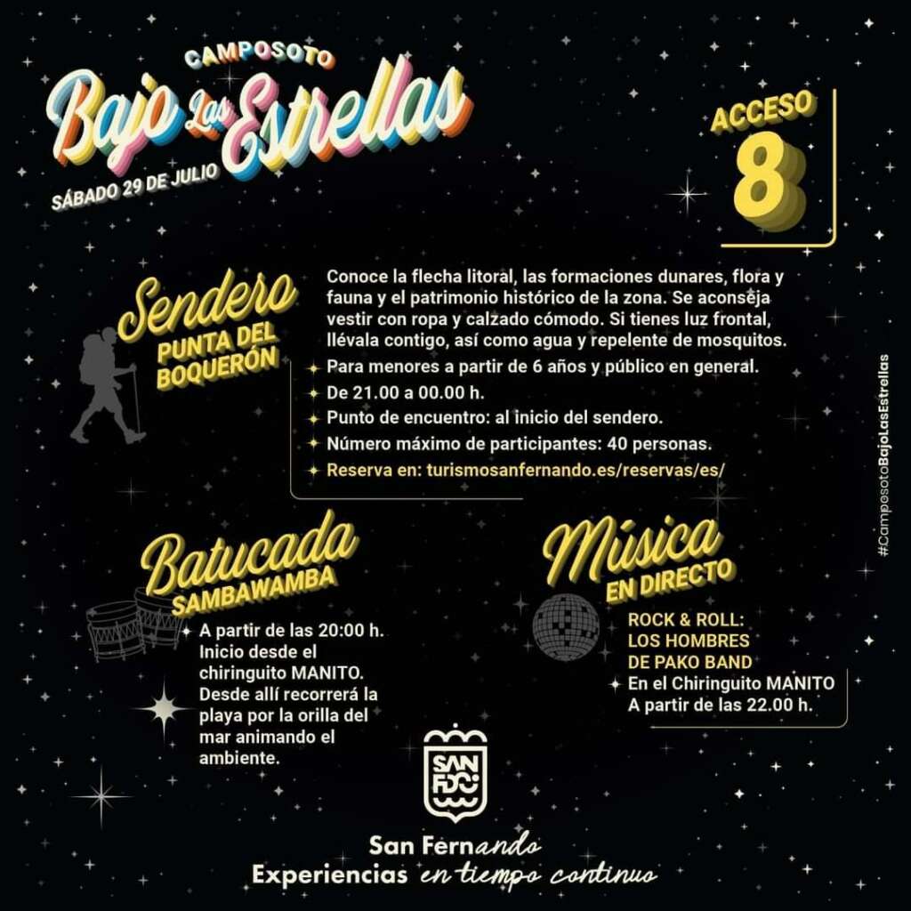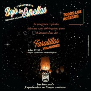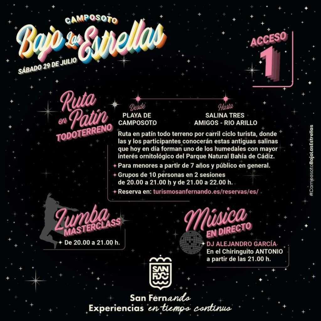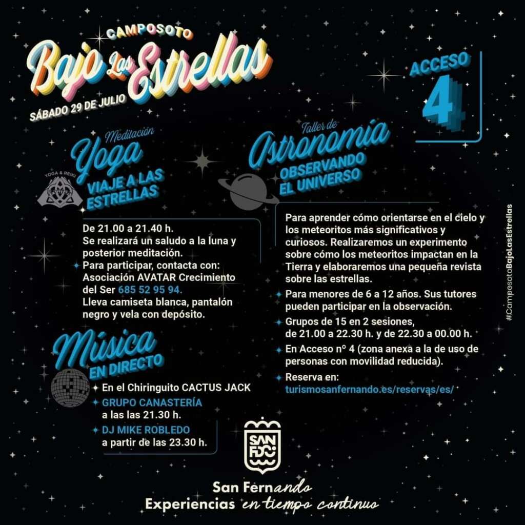 Una de las citas imprescindibles del verano con “un extenso programa de actividades diseñado para vivir una noche mágica en familia o entre amigos”. Camposoto Bajo las Estrellas vuelve al calendario estival de San Fernando este sábado 29 de julio y lo hace con propuestas para todos los públicos y gustos: sesiones de DJ, conciertos, zumba, yoga, rrutas medioambientales, un taller infantil astronómico de observación, una batucada y la ya esperada suelta de farolillos,