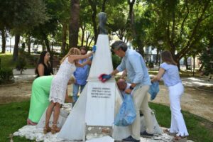 El acto ha incluido la tradicional ofrenda floral y, en esta ocasión ha concluido, con una limpieza participativa del conjunto escultórico en memoria a Blas Infante del Parque Almirante Laulhé, que muestra un lamentable estado de abandono y suciedad.