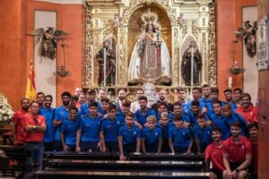 La expedición azulina, que ha estado encabezada por el presidente Louis Kinziger y con el director deportivo, Miguel Chocarro, ha contado con la primera plantilla al completo. Como viene siendo habitual, la primera en recibir la visita de la expedición ha sido Nuestra Señora del Carmen Coronada , patrona de la ciudad de San Fernando, en la Iglesia del Carmen.