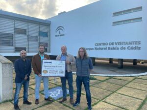 El delegado territorial de Sostenibilidad, Medio Ambiente y Economía Azul de la Junta de Andalucía, Óscar Curtido, junto al profesor de la UCA y presidente de la junta rectora del Parque Natural de la Bahía de Cádiz, Javier Benavente, y el director conservador de este espacio natural protegido, Rafael Martín, así como Miguel Ángel de Alba, gerente de la UTE Melqart Hércules Sancti Petri, han mostrado el resultado de la actividad de apoyo al chorlitejo patinegro desarrollada en Sancti Petri, en Chiclana, el pasado verano.