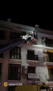 Los bomberos San Fernando actúan en el saneado de una cornisa en el edificio de la calle Real número 188, justo frente de los juzgados de San Fernando.