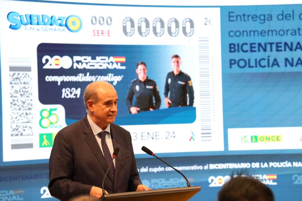 Un total de cinco millones y medio de cupones para el sorteo del 'Sueldazo del Fin de Semana', que tendrá lugar el próximo día 13, conmemorarán esta efeméride por toda España. El cupón, que ha sido presentado esta mañana en un acto que ha contado con la presencia del director general de la Policía, Francisco Pardo Piqueras, y el vicepresidente del Grupo Social ONCE, Alberto Durán López, incluye el lema “Comprometidos contigo”, y la referencia al periodo 1824-2024 en conmemoración al 200 aniversario.
