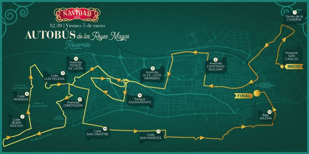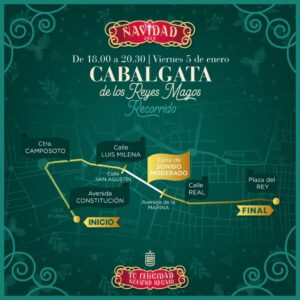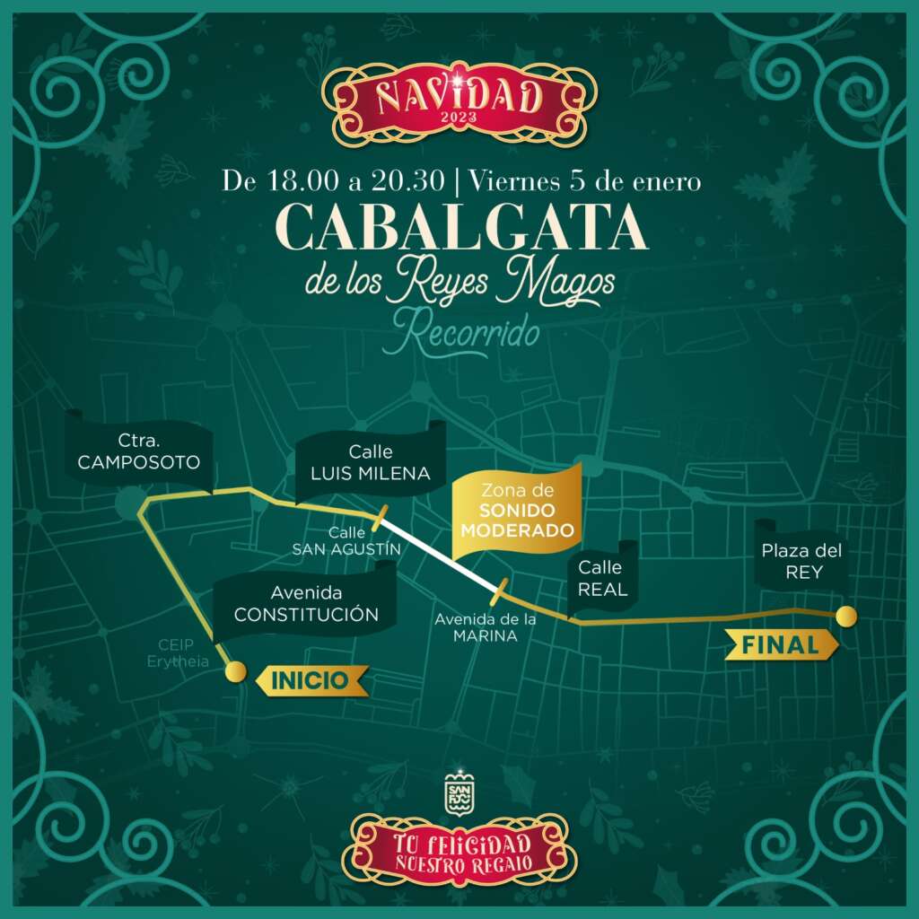 A las 18:00 horas, Sus Majestades los Reyes de Oriente -acompañados por la Estrella de Oriente, el Heraldo Real y sus respectivos cortejos- partirán desde la Avenida de la Constitución en un recorrido modificado para este 2024, ya que su punto final no será el Castillo de San Romualdo. Así, la comitiva atravesará toda la avenida para encarar la carretera de Camposoto, enlazar con las calles Luis Milena y Real y culminar en torno a las 21.00 horas en la Plaza del Rey, el corazón isleño de la Navidad y estampa de todos los emotivos momentos que se han ido sucediendo durante un diciembre cargado de actividades y propuestas culturales, musicales y de ocio. Gaspar (Francisco Cid Fornell), Melchor (Manuel Millán Sánchez) y Baltasar (Jaime Lanceta Gutiérrez) -escoltados por la Estrella de Oriente (Carmen Fernández Gutiérrez) y el Heraldo Real (Jesús Guerrero)- atravesarán la plaza en un camino especialmente habilitado para ello durante el que saludarán a los niños que quieran recibirlos junto a la alcaldesa, Patricia Cavada. De este modo, el final de la cabalgata dará paso a un gran espectáculo sobre el escenario de la Plaza del Rey. Este albergará la Adoración de los Reyes al niño Jesús y tendrá como protagonistas a los propios Reyes Magos y a los niños de San Fernando.
